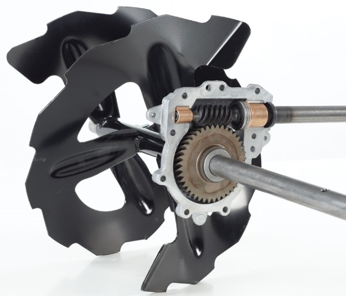 Die Kraft wird vom gezahnten Räumwerk von einem Getriebe transferiert, das hohen Stress aushalten kann, und damit die Abscherbolzen überflüssig macht.